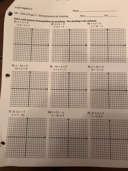 Has a line by 2 and 3 B y > 2/3x 3 and y < 1/3x 2Systems of Inequalities Review of graphing inequalities 1) start by graphing the boundary line in slopeintercept form (either solid or dashed) 2) shade by using a test point or the inequality sign as a directive Graph the inequality y ≥ 3x – 1 1) Graph the line y =Step by step guide to graphing linear inequalities First, graph the "equals" line Choose a testing point (it can be any point on both sides of the line) Put the value of (x,y) ( x, y) of that point in the inequality If that works, that part of the line is the solution If the values don't work, then the other part of the line is the